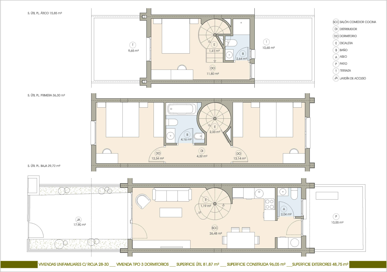 El total de superficie construida de la vivienda es de 96.05 m2 + 48.75 m2 exteriores.