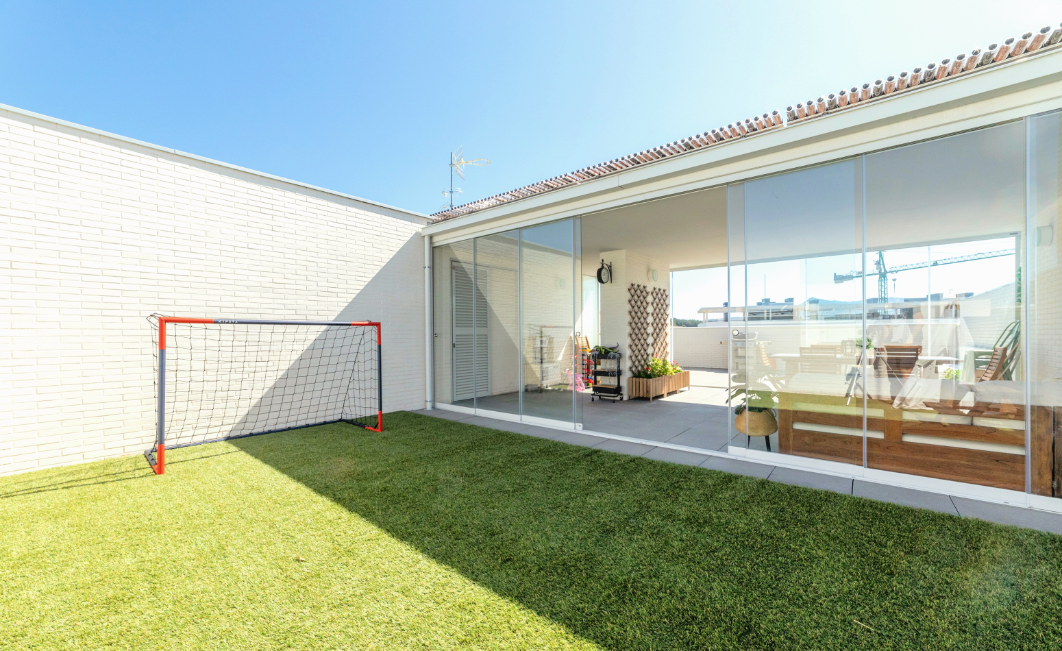 Terraza en ático con tres zonas diferenciadas, porche cubierto acristalado, zona de césped y zona pavimentada