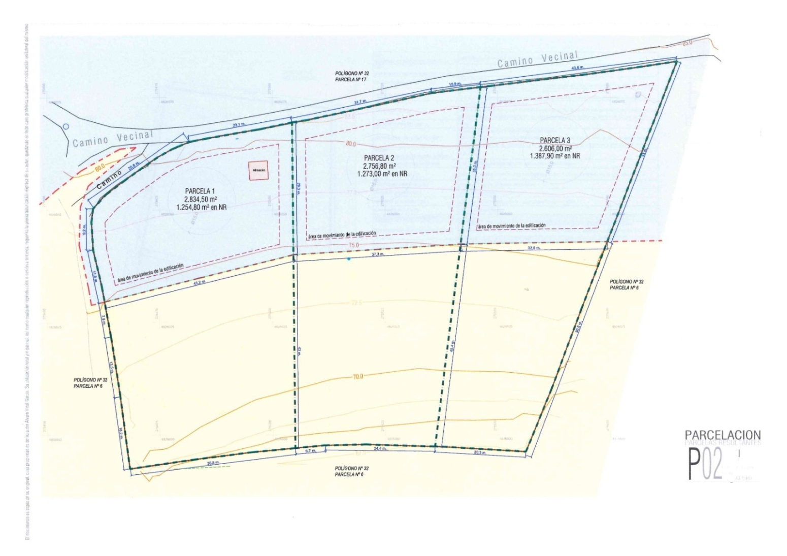 Quedarían tres parcelas de 2.834 m, 2.756m y 2.606m. Las tres edificables para una vivienda de 300 metros construidos.